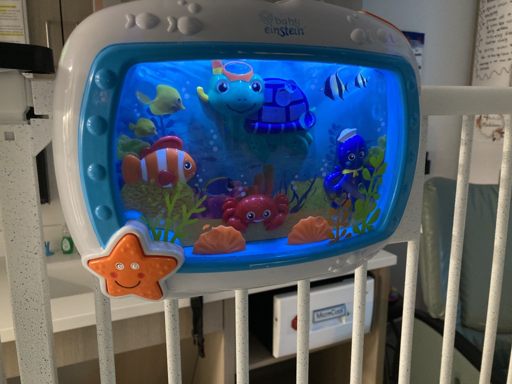 Too much talking if you ask me! “Hears” the thing, not being able to hear all the racket and beeping during my first few months of life hasn’t been all that terrible but I do want to hear my Mama’s voice. I can see, smell, feel and taste her just fine. And now it makes more sense to her…why I never startle to loud, obtrusive noises; why I follow objects so intensely with my eyes; why I am so attracted to beautiful people and bright, beautiful things; why I love watching my “under-the-sea contraption” hanging on my crib and new doll and picture book.