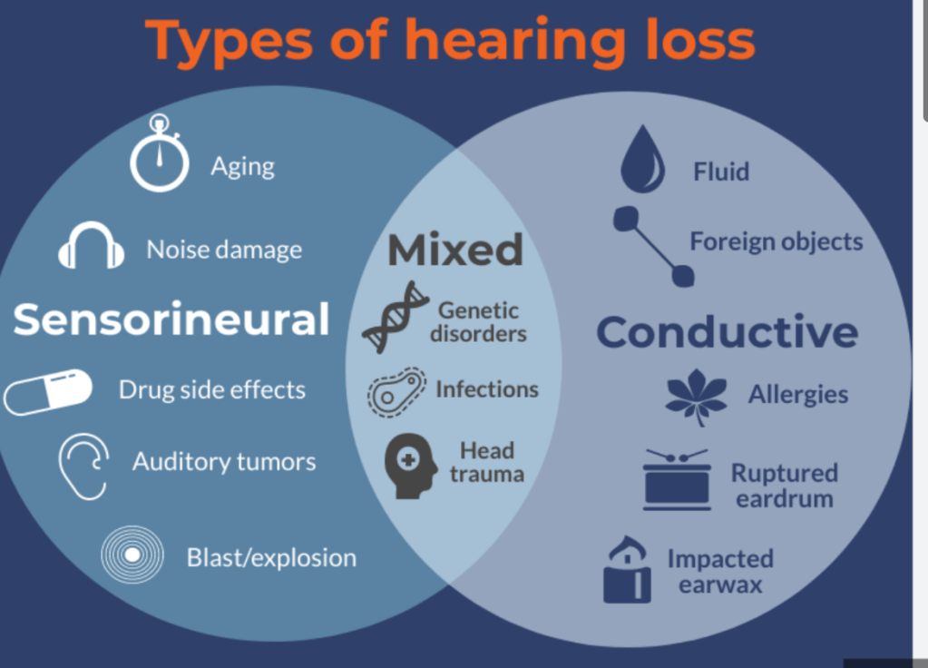 There are basically two types of hearing loss: Sensorineural deafness (damage to the inner ear) or Conductive deafness (under-developed outer ear canal/ wax-liquid build-up.